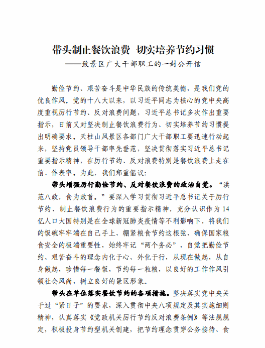 帶頭制止餐飲浪費 切實培養(yǎng)節(jié)約習(xí)慣 ——致景區(qū)廣大干部職工的一封公開信