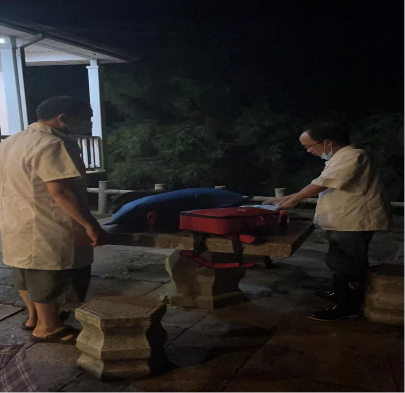 得悉萬女士的緊急狀況,指導(dǎo)員第一時(shí)間聯(lián)系了景區(qū)綜合執(zhí)法大隊(duì)大隊(duì)長劉運(yùn)中,劉運(yùn)中接到匯報(bào)后立刻安排天柱山急救站醫(yī)護(hù)人員與執(zhí)法隊(duì)員、景區(qū)派出所工作人員一起前往煉丹湖接待中心進(jìn)行救助,安排客運(yùn)公司人員駕駛急救車輛在大龍窩游客出口待命,同時(shí)向景區(qū)管委會(huì)相關(guān)領(lǐng)導(dǎo)和市疫情防控指揮部進(jìn)行了匯報(bào),并奔赴景區(qū)現(xiàn)場指揮救助。于是,雷雨交加的景區(qū)山徑夜幕中就出現(xiàn)了一群打著手電筒行色匆匆的一群人。