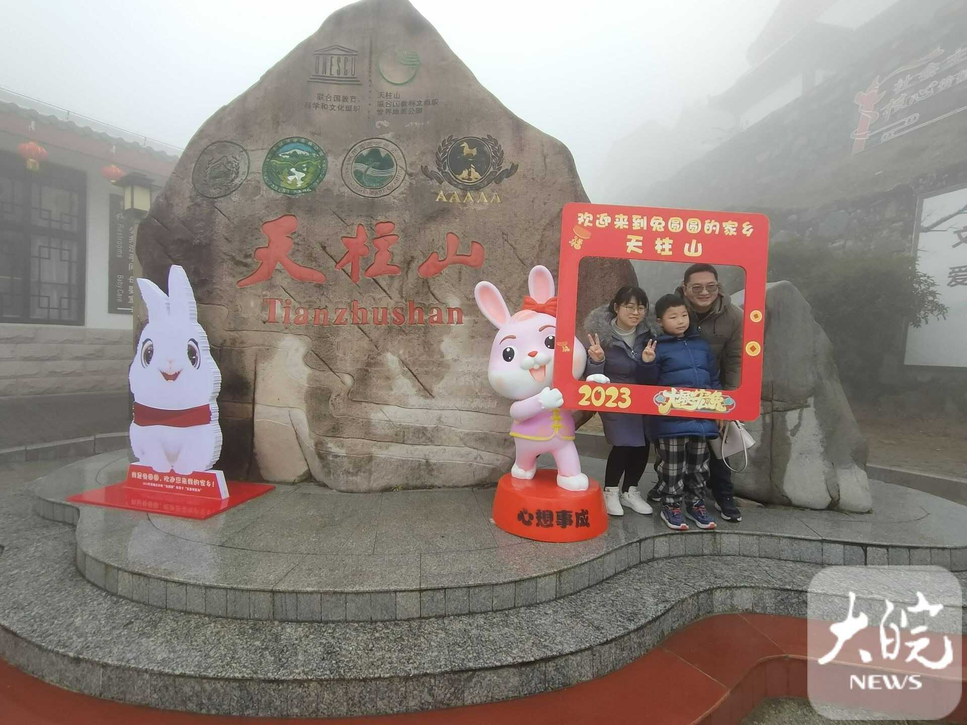 春節(jié)假期,天柱山風(fēng)景美,年味濃,景區(qū)在馬祖、茶莊游客中心、天池峰等多處設(shè)有歡慶新年的“兔圓圓”卡通形象,游客在這里拍照,許下美好愿望?!敖衲甏汗?jié)帶著家人在天柱山旅游過(guò)年,提前在網(wǎng)上預(yù)訂好民宿,一家人開心快樂(lè)地體驗(yàn)山岳風(fēng)情,吃農(nóng)家菜、看民俗、滑冰雪、賞美景,體驗(yàn)“慢生活”,在“兔圓圓”故鄉(xiāng)過(guò)兔年,意義非凡?!眮?lái)自上海的余先生開心地說(shuō)。