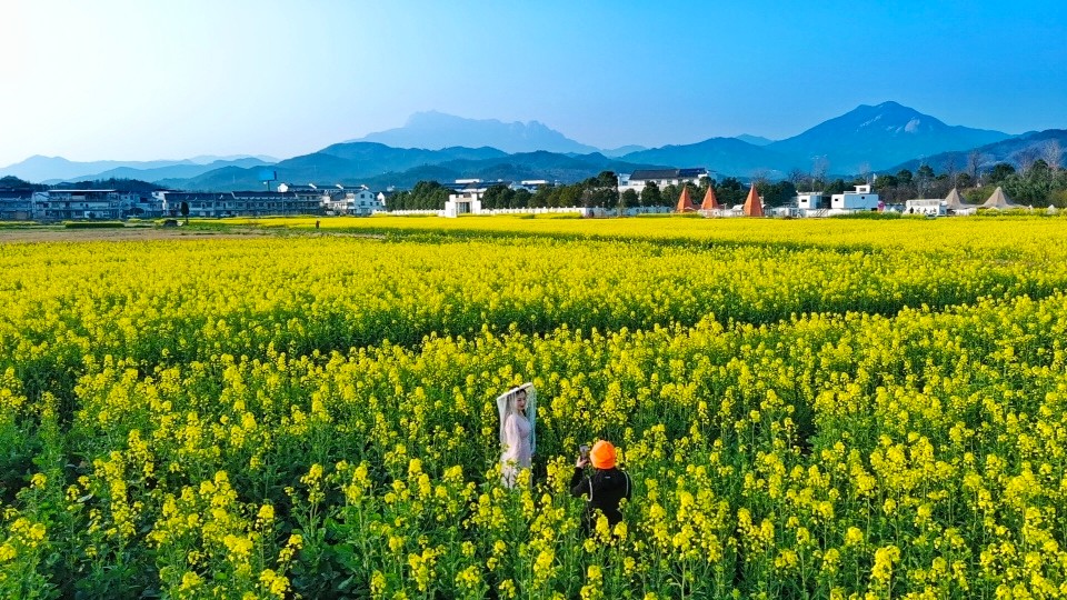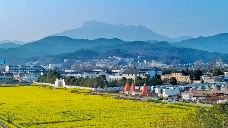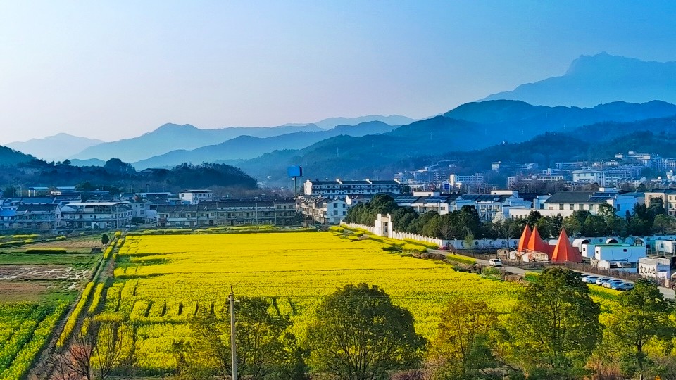 山腳下,油菜花鋪展開去,一片金黃。